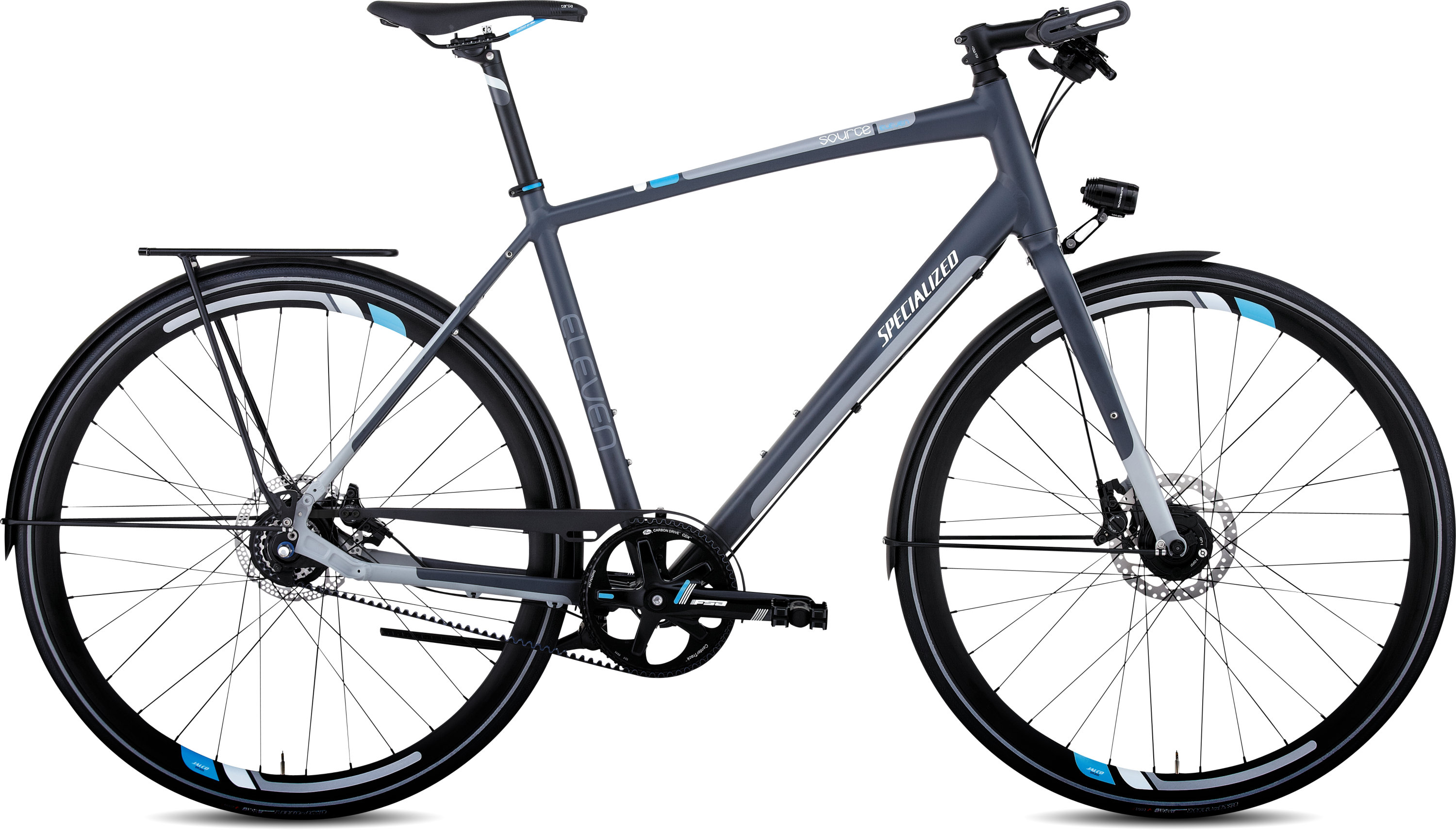 A true multi-tasker for anything from commuting to a weekend camping trek down the coast with loaded panniers, the Source Eleven does it all anytime, anywhere with disc brakes and integrated lights, rack, and fenders; plus 11-speed Shimano Alfine internal gearing with belt drive for the ultimate in low-maintenance efficiency.All-new, super light E5 fully-manipulated alloy frame is built for high speed, low-fuss, and great versatility, with tapered head tube, internal routing, rack/fender mounts, and wide tire clearance; Plus open rear triangle for belt drive.